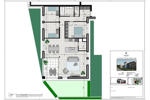 Dit appartement is gelegen in Residentie Riverside II te Lier, een nieuwbouwproject gebouwd in een moderne stijl in het centrum van Lier. Dit BEN appartement EPC 31kWh/m² jaar) heeft een oppervlakte van 111,54m² bevindt zich op het gelijkvloers en omvat: inkomhal, toilet, leefruimte met veel lichtinval, open keuken, 3 slaapkamers, badkamer met dubbele wastafel en inloopdouche, berging, terras en tuin hebben zicht op de groene gordel rond Lier. Er bestaat een mogelijkheid tot het huren van een ondergrondse autostaanplaats met toegang via een autolift aan € 100 (+ € 30 indien men gebruik wil maken van een laadunit), de laadunit heeft een respectievelijk maximum vermogen van 22kW (zeer krachtig voor een thuisinstallatie), alle armaturen zijn voorzien van LED verlichting, vloerverwarming (via warmtepomp), zonnepanelen (gemiddeld verbruik € 1000 à € 1200 per jaar) kelderberging (nr. 2.01 op -1) . Lift en fietsenberging met lockers zijn aanwezig. De residentie is voorzien van een ruime en mooi aangelegde binnentuin. De maandelijkse provisiekost bedraagt €150 (onderhoud WP en ventilatie, poetsen ramen, poetsen gemene delen, elec. gemene delen, onderhoud personen en autoliften, ...). Recente foto's zijn niet beschikbaar. Plannen zijn onderaan te downloaden. Dit appartement is vrij vanaf 1 december 2025.