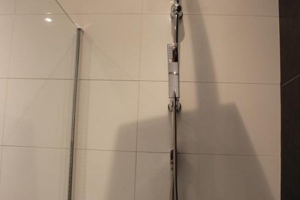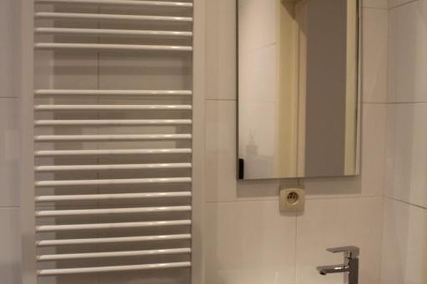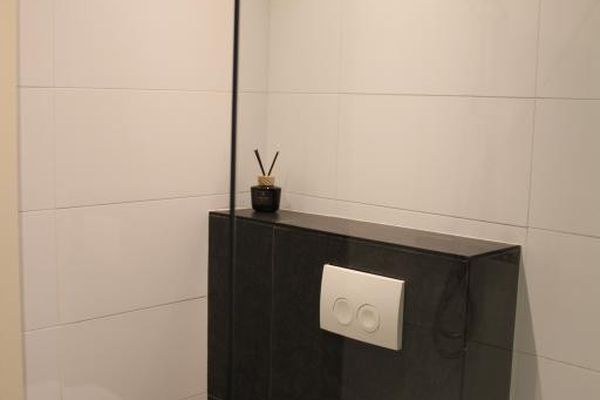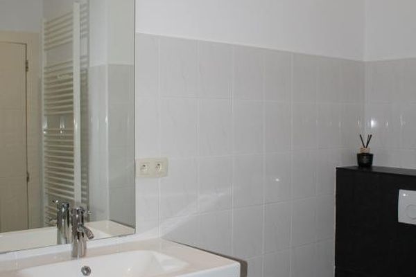 gelijkvloers en voorzien van toilet, lavabo en inloopdouche