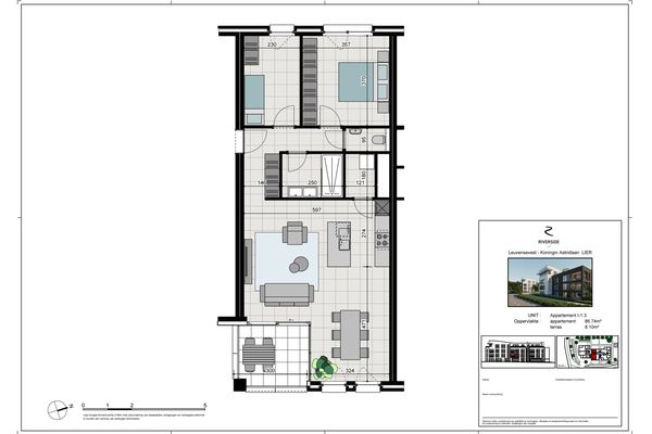 Dit appartement is gelegen in Residentie Riverside I, een nieuwbouwproject gebouwd in een moderne stijl op wandelafstand van de Grote Markt te Lier. Dit BEN appartement (EPC 21 kWh/m² jaar) heeft een oppervlakte van 86,74m² is overal voorzien van vloerverwarming en is afgewerkt met hoogwaardige materialen, bevindt zich op de eerste verdieping en omvat: inkomhal, toilet, leefruimte met natuurlijk lichtinval, open keuken, 2 slaapkamers, badkamer met dubbele wastafel en inloopdouche, berging, terras met zicht op de groene gordel rond Lier. Er bestaat een mogelijkheid tot het huren van een ondergrondse autostaanplaats met toegang via een autolift aan € 100 (+ € 30 indien men gebruik wil maken van een laadunit), de laatunit heeft een respectievelijk maximum vermogen van 22kW (zeer krachtig voor een thuisinstallatie), alle armaturen zijn voorzien van LED verlichting, kelderberging (nr. 1.04 op -1), zonnepanelen (gemiddeld rendement € 1000 à € 1200 per jaar). Lift en fietsenberging met lockers zijn aanwezig. Kleine huisdieren zijn toegelaten. De residentie is voorzien van een ruime en mooi aangelegde privé binnentuin. maandelijkse provisiekost bedraagt €150 (onderhoud WP en ventilatie, poetsen ramen, poetsen GD, elec. GD, onderhoud tuinen). Plannen zijn onderaan te downloaden.